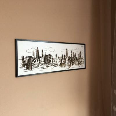 Modern falikép, amely fekete keretben ábrázolja New York panorámájának vázlatát. A DUBLEZ által készített 3D luxus, gravírozott fakép Manhattan partját mutatja be. Ez az eredeti kép garantáltan magára vonja mindenki figyelmét, ezért tökéletes nappaliba, előszobába vagy gyerekszobába. A DUBLEZ termék remek ajándék a szenvedélyes utazóknak, különösen azoknak, akik rajonganak a soha nem alvó New York városáért.