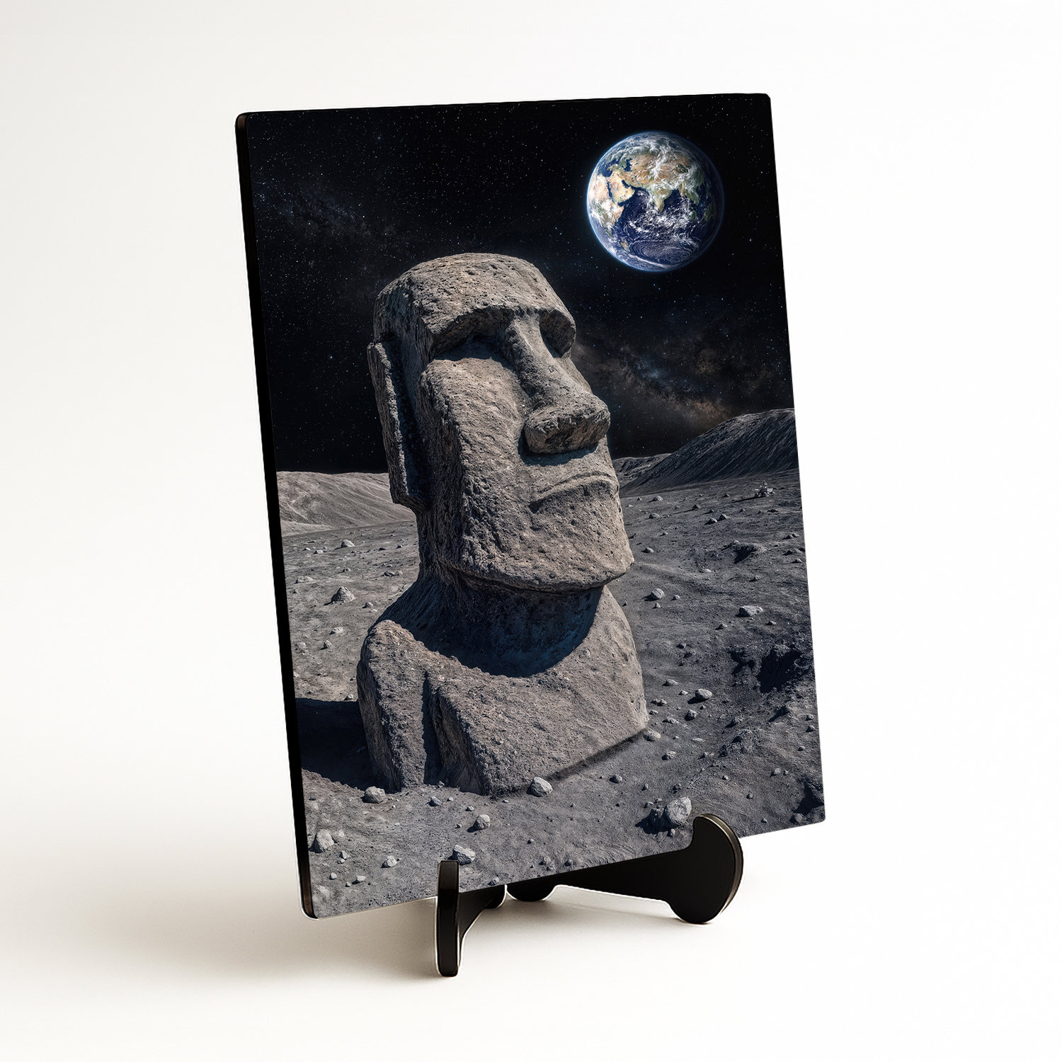 Eredeti kép a kőszoborról a hold felszínén szokatlanul ötvözi a realista környezetet és a szürrealista motívumot. A monumentális fej a Húsvéti-szigetek szobrai által inspirálva emelkedik ki a kopár holdi tájból, míg a Föld bolygó és a csillagos ég háttérben lenyűgöző kontrasztot alkot az ősi üzenet és a végtelen univerzum között. A kép remekül illik egy diákszobába vagy irodába, különösen a modern, ipari vagy futurisztikus stílusú belső terekbe.