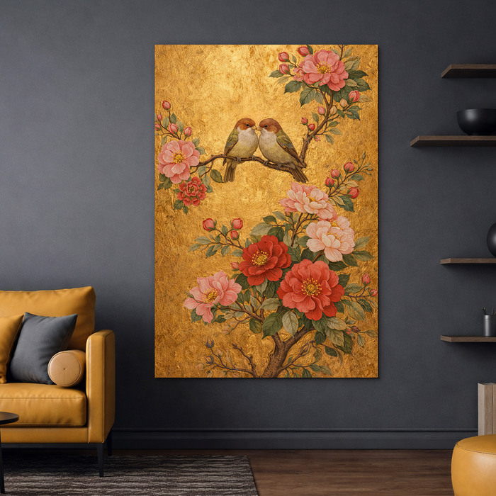 A két madár ül a virágzó ágon luxusos képe lenyűgöz részletes kidolgozásával és gazdag arany háttérével. Minden részlet – a szirmoktól a tollakig – esztétikai érzékkel van megformálva, így a kép klasszikus műalkotásokra emlékeztet, retro stílusú árnyalattal. A fa kép tökéletesen illik a folyosóra, a bejárati térbe vagy a reprezentatív előcsarnokba, ahol azonnal felhívja a figyelmet.