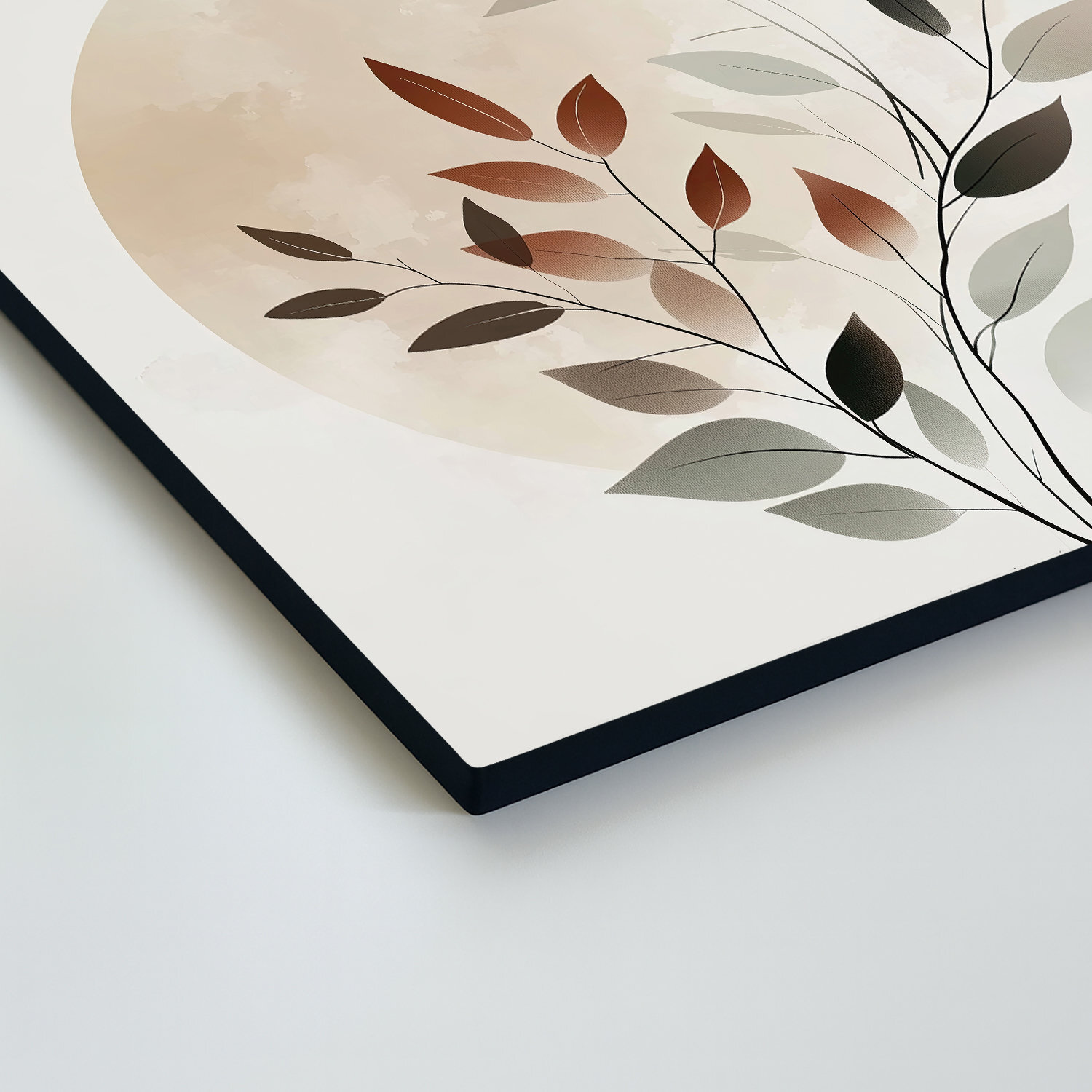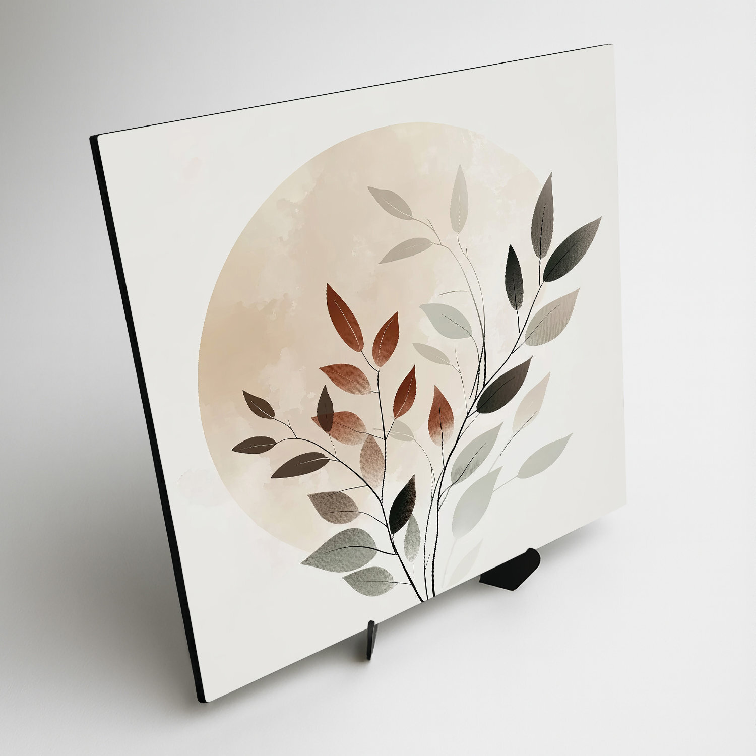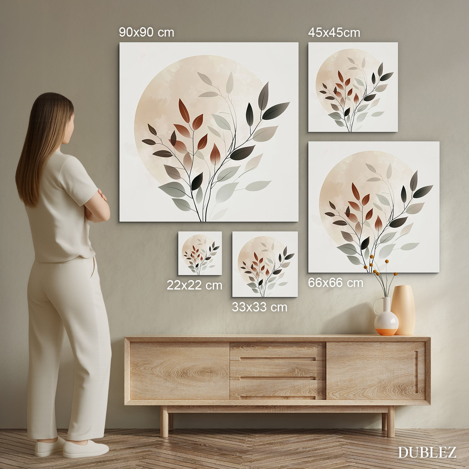 A Levelek egy körben című fából készült kép természetes varázst és a minimalista boho stílus báját hozza el otthonába. A meleg árnyalatokban pompázó levelek harmonikus kör motívumba rendeződnek. Ez a fa kép tökéletes fali dekoráció a nappaliba, hálószobába vagy előszobába.