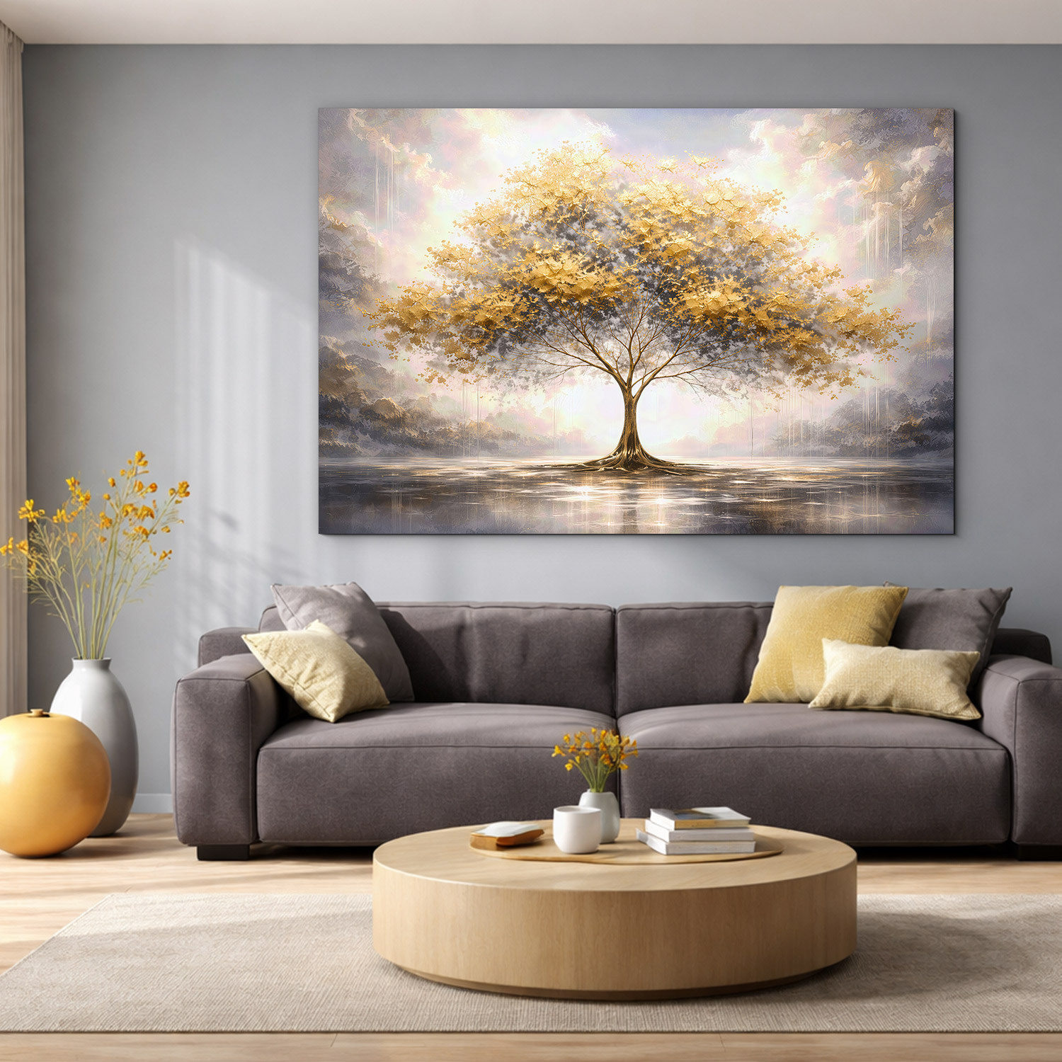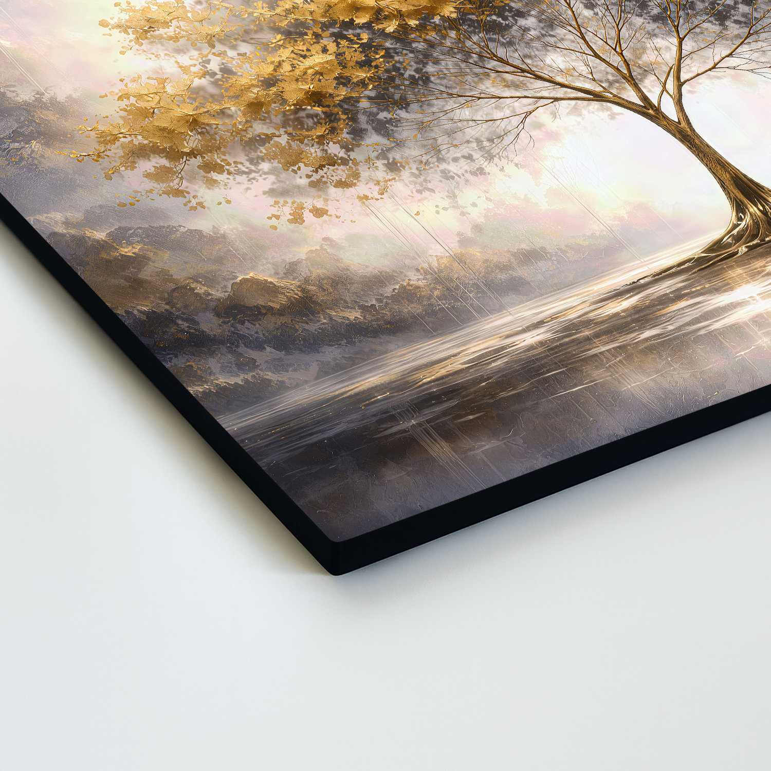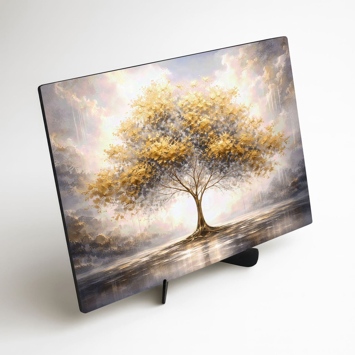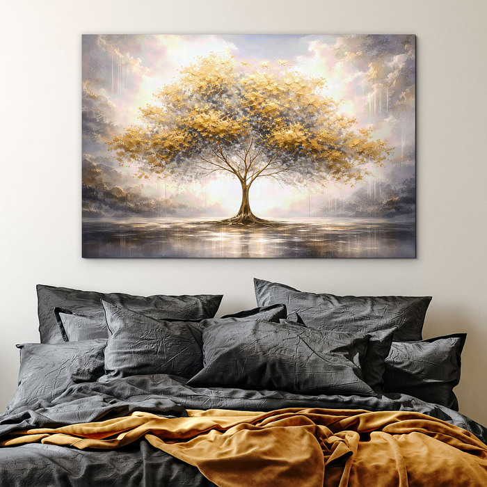 A fából készült aranyfa kép fenséges, nyugodt és nagyon elegáns hatást kelt. A fa finoman ragyogó koronája a víz felszínén tükröződik, és harmonikus képet alkot, tele fénnyel, egyensúllyal és csendes szépséggel. Az arany, krém és szürke színek kombinációja finom luxus érzetet ad a képnek. Az élet fája gyönyörűen illik nappaliba, hálószobába, konyhába és előszobába.