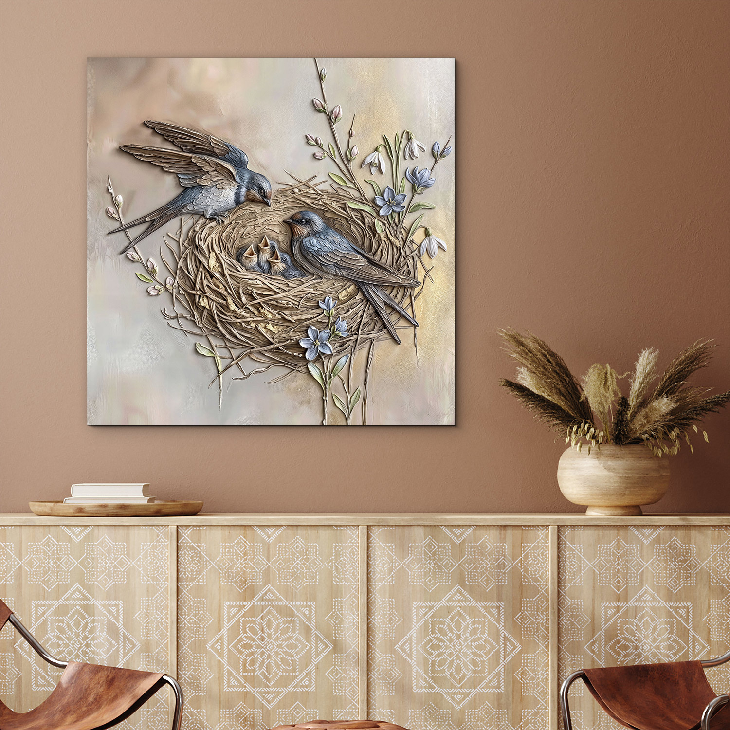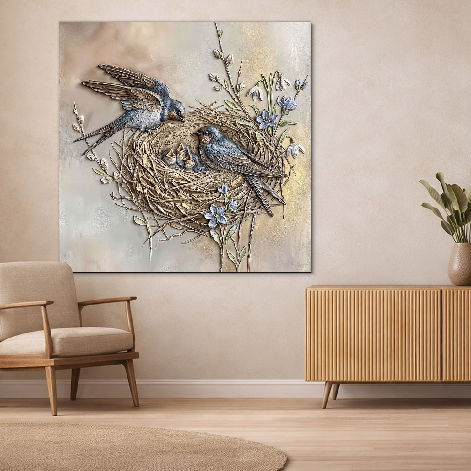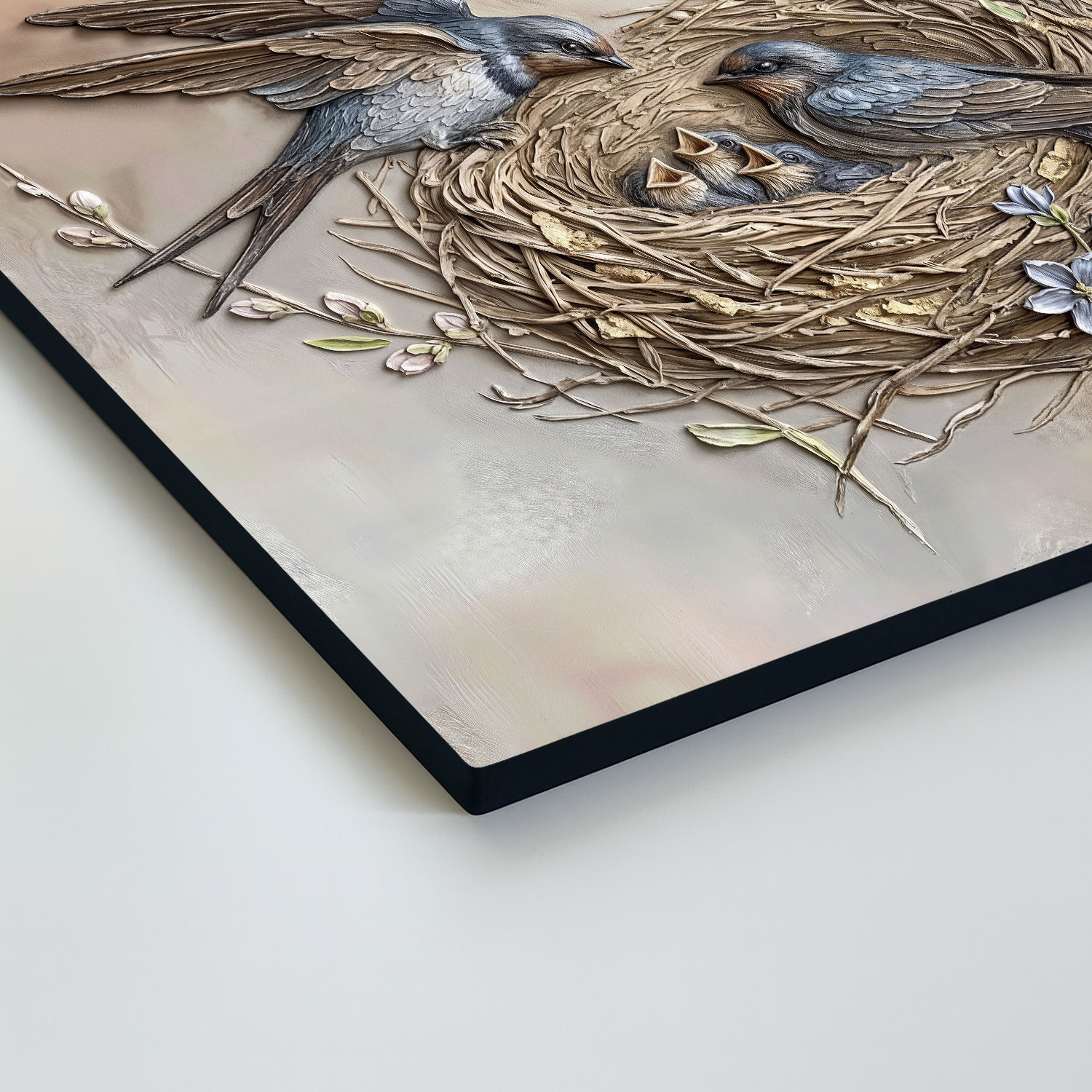 A részletesen kidolgozott madárkép a fészekben egy madáréletből vett jelenetet ábrázol, hangsúlyozva a finom részleteket és a dekoratív kivitelezést. A színes fa kép remekül illik a nappaliba, hálószobába, gyerekszobába vagy folyosóra, különösen a természetes, vintage vagy skandináv stílusú belső terekbe. Eredeti ajándékként is megfelelő szülőknek, családnak vagy a természet kedvelőinek, akik értékelik a finom motívumokat.