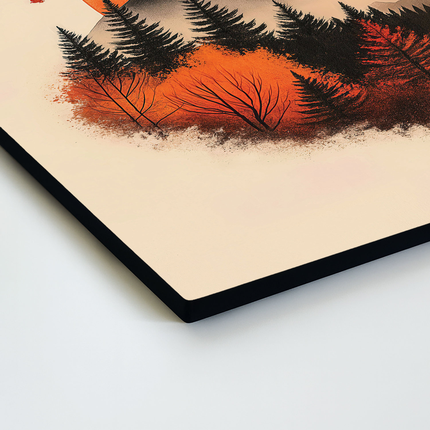 A fák képe a hegyekről modern motívumával átalakítja a falat az erdő és az őszi napfény. Mindenkinek szól, aki otthonosan és részletekre érzékenyen szeretne élni. A meleg őszi színek, mint a téglavörös, mézes vagy piros, biztonság és a haza melegének érzését keltik. Ideális a nappaliba, dolgozószobába, olvasószobába vagy műterembe. Illik a boho, természetes, klasszikus és skandináv lakberendezési stílushoz.