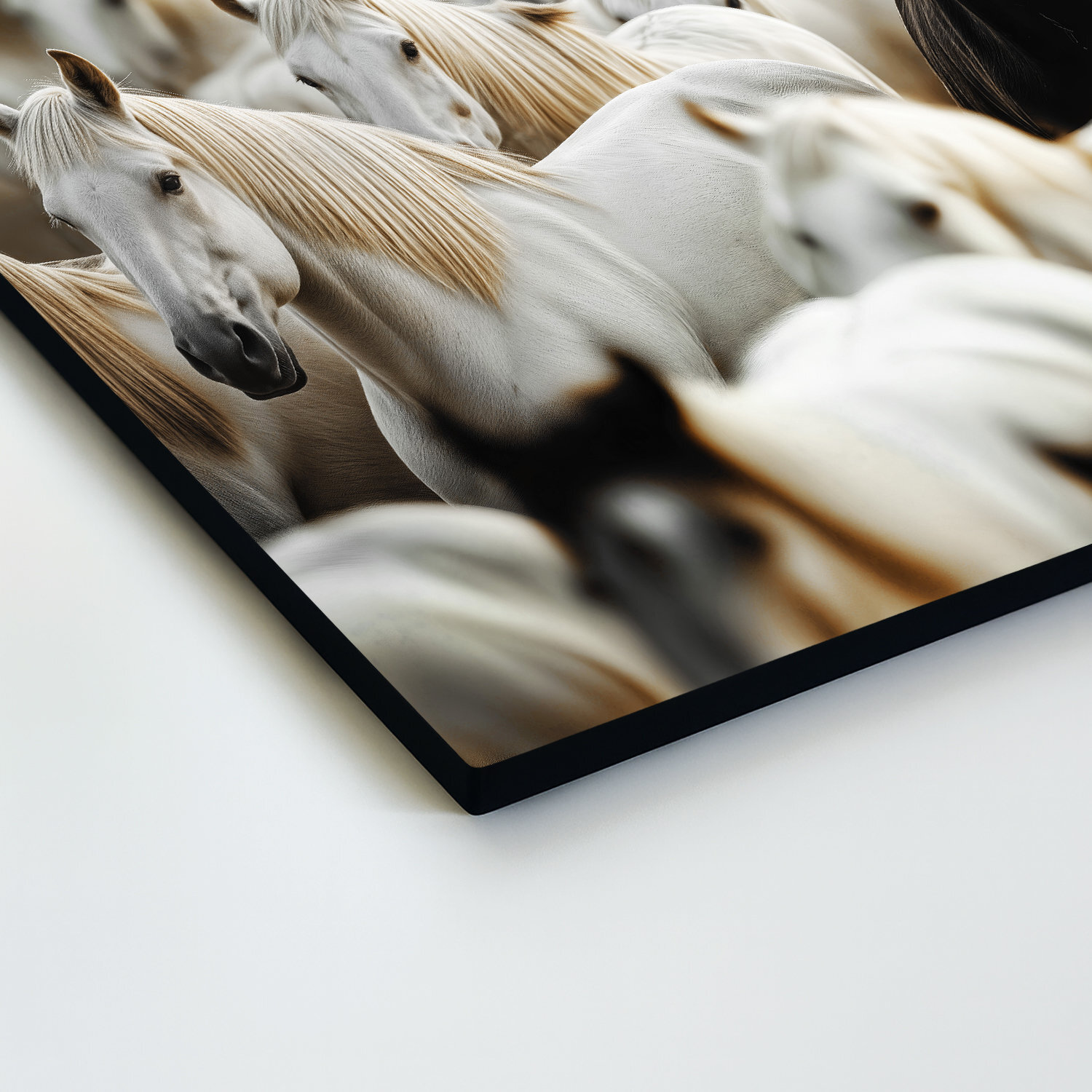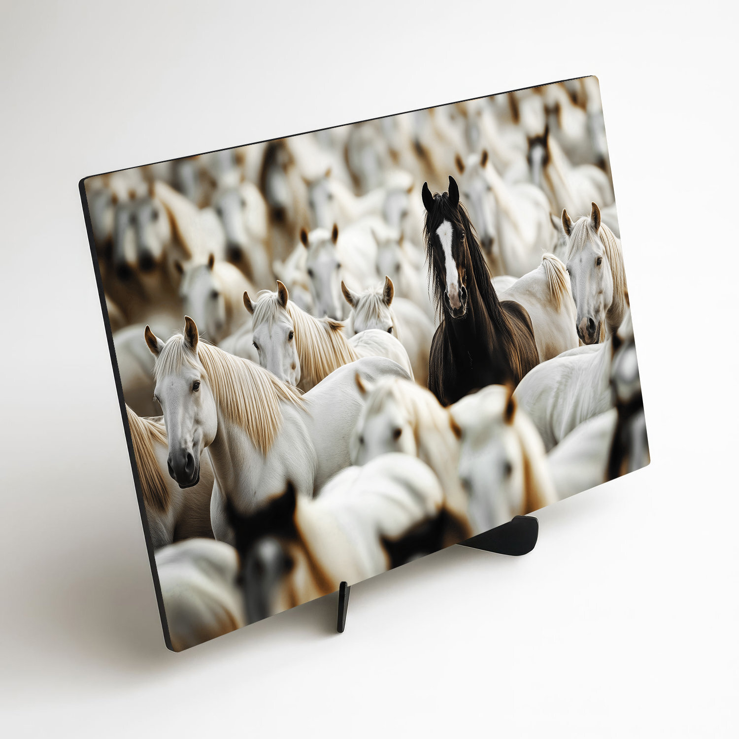 Ez a színes fa falikép egy fekete lovat ábrázol fehér lovak között – az egyediség, a különlegesség és a bátorság erőteljes üzenetét hordozza. A stílusos falikép erőteljes vizuális hatását a kontrasztos színek és a tudatos kompozíció adják. Kiválóan mutat modern belső térben, világos nappaliban vagy elegáns előszobában. A semleges színpaletta letisztult, harmonikus és időtálló hangulatot teremt.