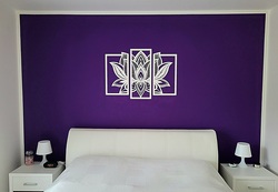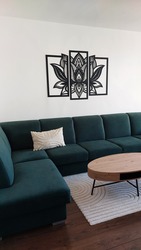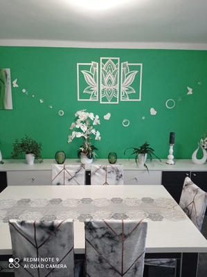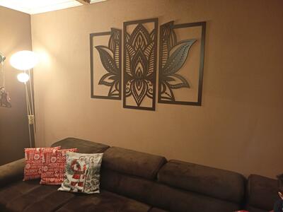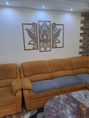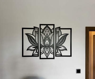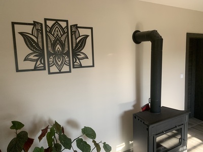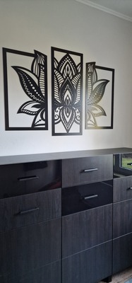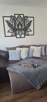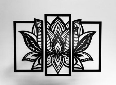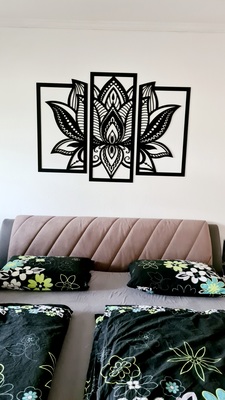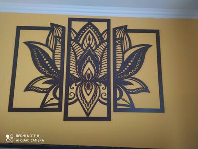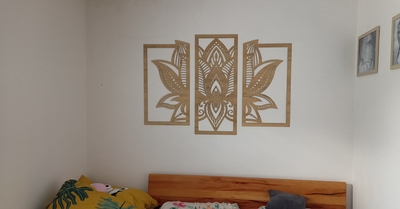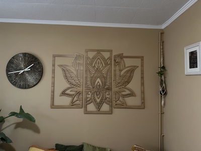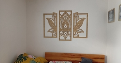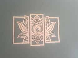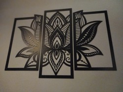 A mandala jelentése: A fábol készült mandala lótuszvirágot ábrázol, három részre osztva, amelyek harmóniát sugároznak a lakásba.