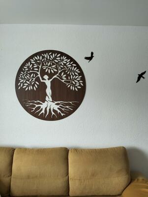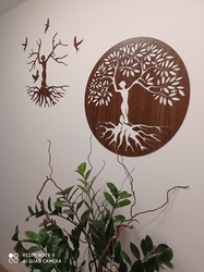 Fából készült életfa női motívummal, ami egy fantasztikus és szokatlan faldekoráció otthonában. Gyönyörűen fog mutatni a nappaliban vagy a hálószobában. A kép két részből áll, egy teljes körből - az élő anyatermészetből és annak téli ellentétéből. A Diva az összes földi és emberi élet minden szakaszát jelképezi. A két rész segítségével optikailag összekötheti a szobákat és kitöltheti a fal üres helyét. Emellett tökéletes ajándékként is megállja a helyét.