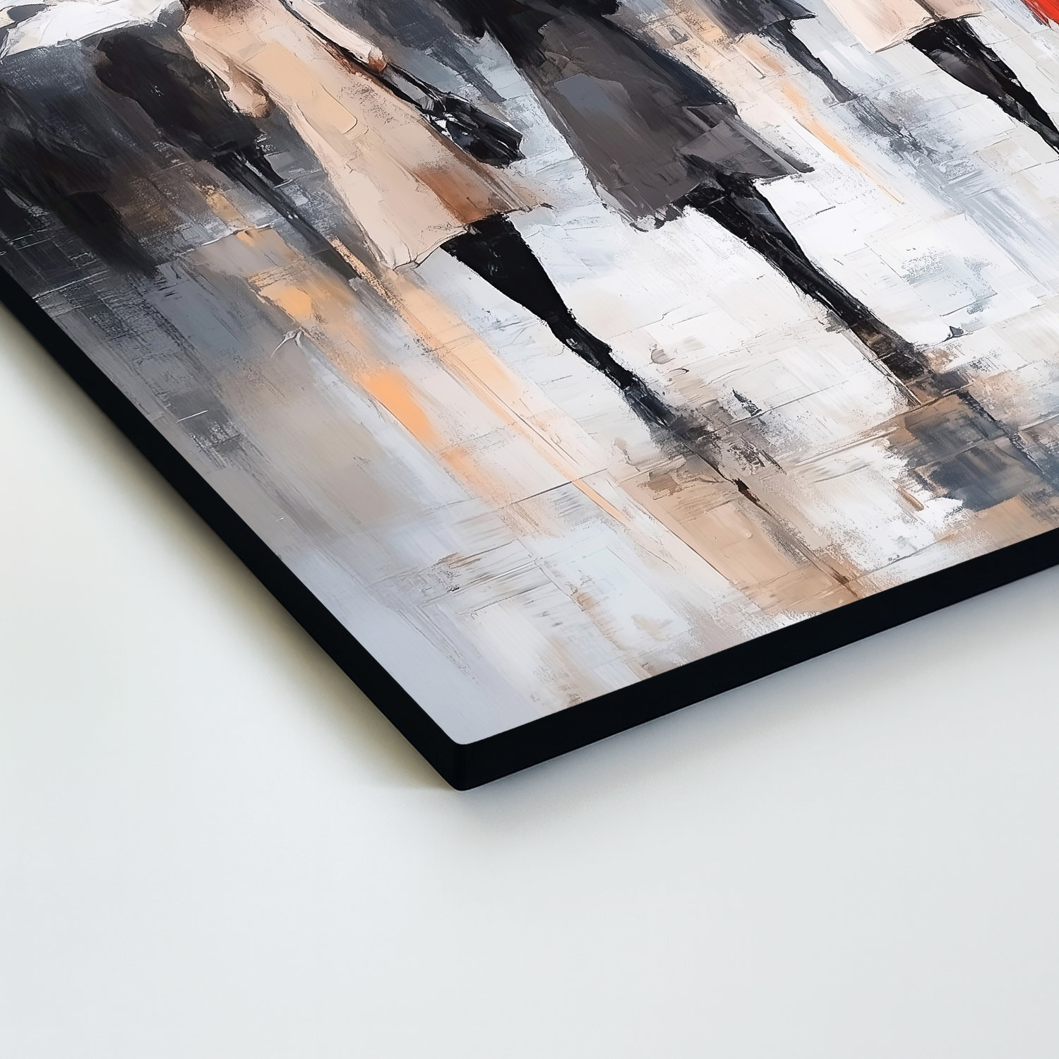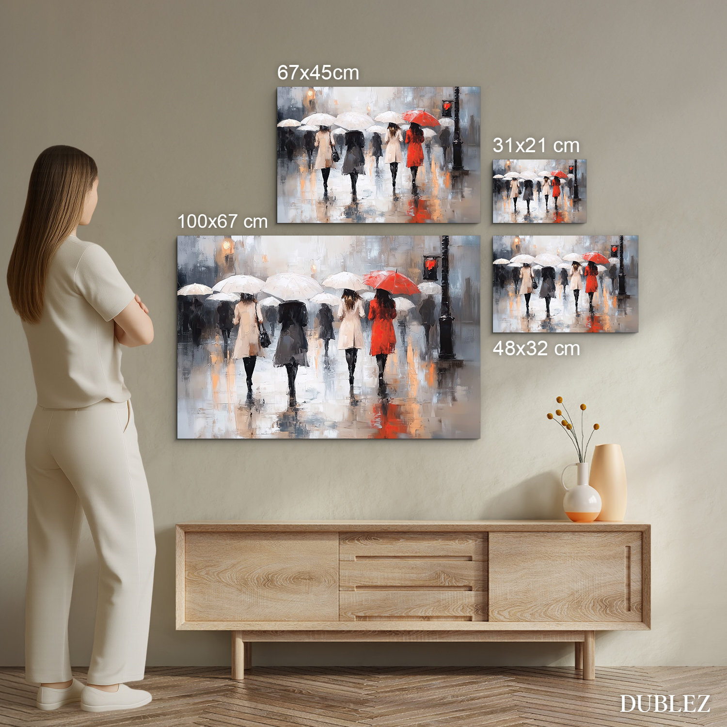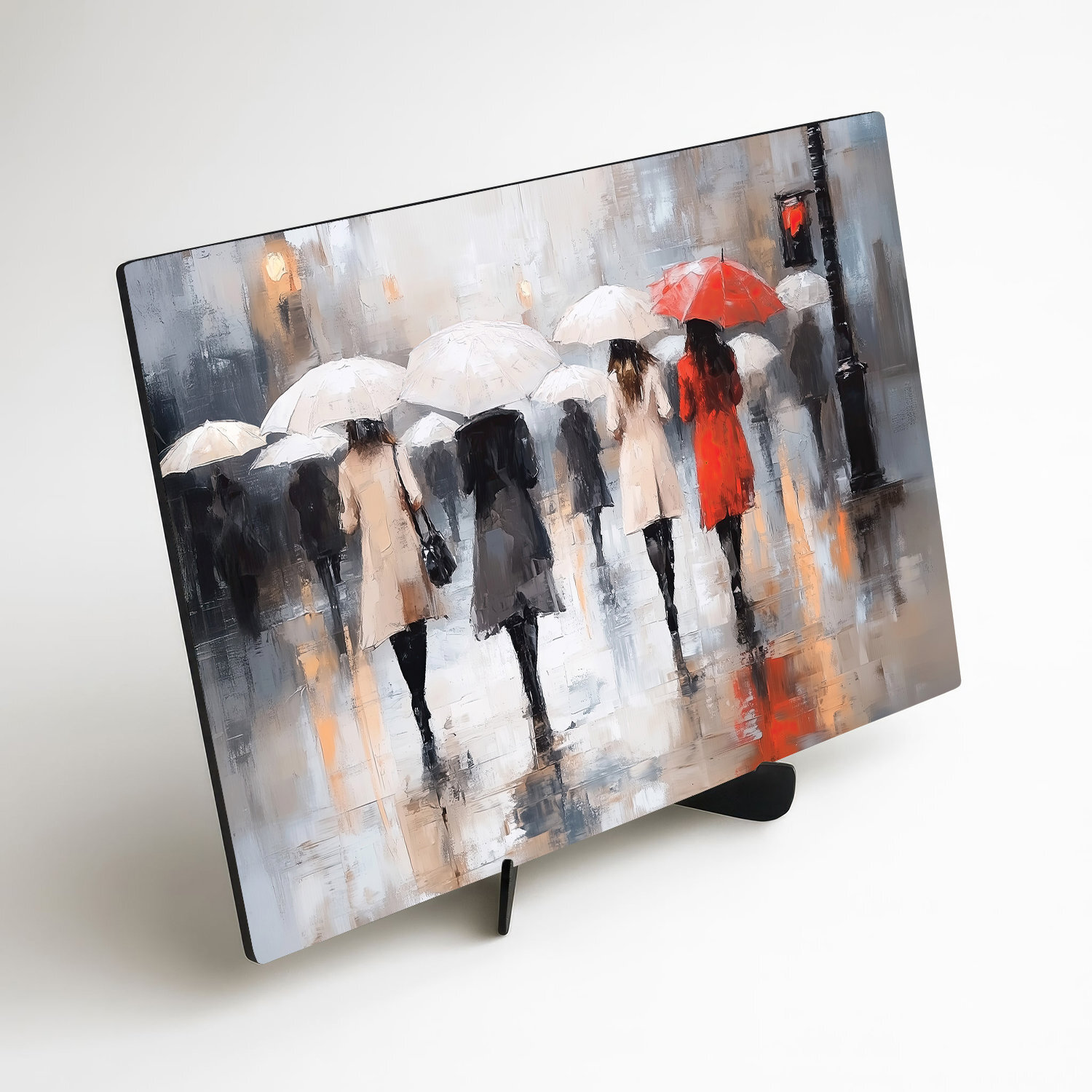 A modern kép nőket ábrázol, amint egy eső áztatta, nedves utcán sétálnak. Az egyik hölgy élénkvörös esernyője és kabátja azonnal magára vonzza a figyelmet. A nőket ábrázoló fa képet javasoljuk modern helyiségekbe, különösen nappaliba, irodába, házi könyvtárba vagy folyosóra.