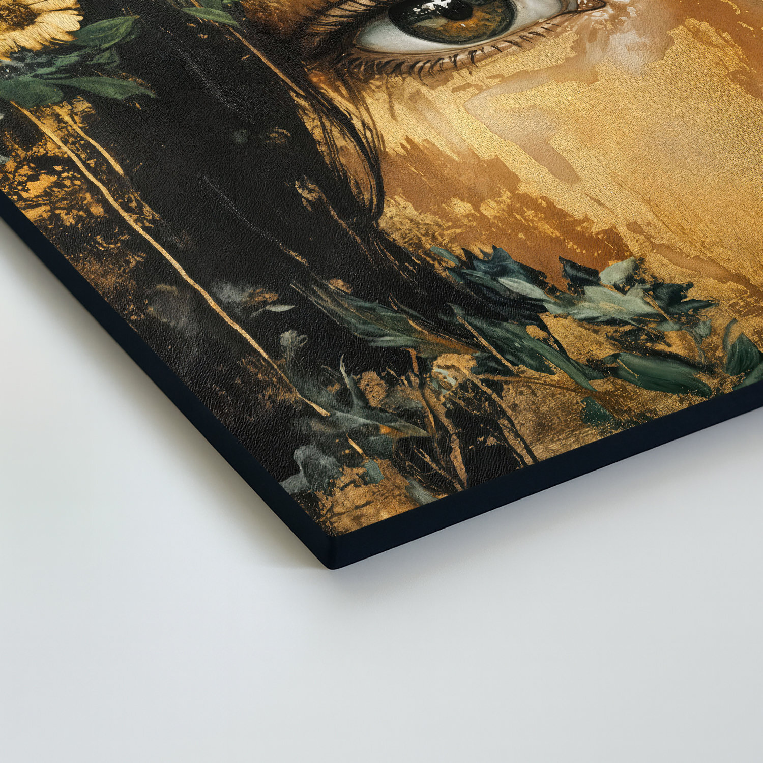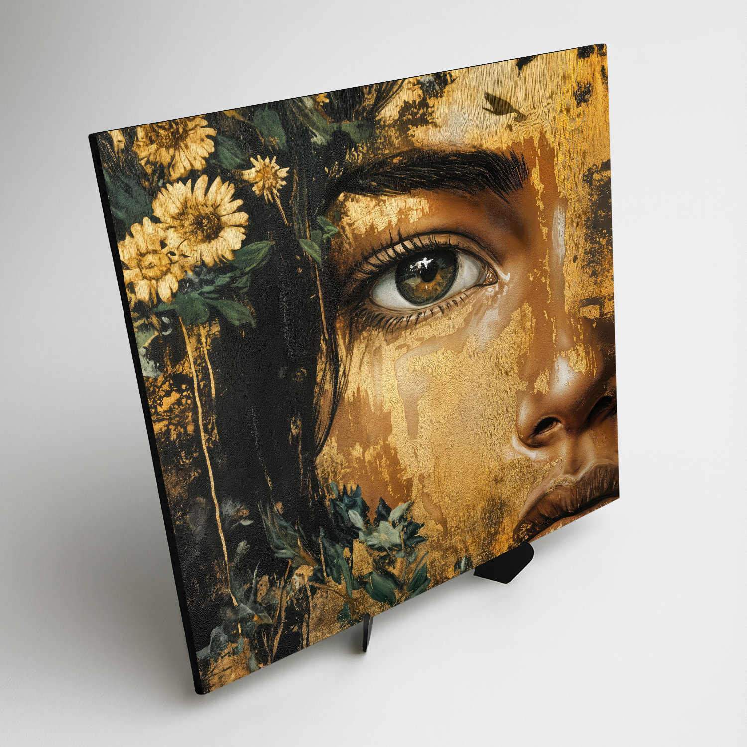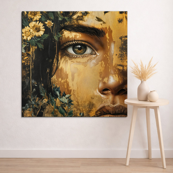 A modern nő képe - Az Erdő Királynője a természet erejét és titkát ragadja meg a női eleganciával összekapcsolva. Az intenzív tekintet, az arany textúrák és a finom virágos részletek gyönyörű képet alkotnak. Az arany színek keverednek a sötét erdei színekkel. A dizájn kép kiemelkedik a nappaliban és a hálószobában is. A fa kép részletekre és textúrára való odafigyeléssel készült, így luxus műalkotásként hat, időtlen kifejezéssel.