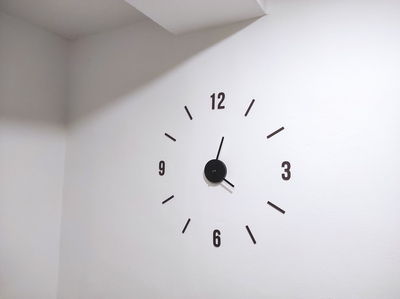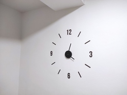 - Ezután kezdjük el a részek ragasztását. Minden ponton ragasszuk fel a hozzá tartozó részt, úgy hogy a rész középpontja körülbelül a pont közepére kerüljön. Nagyon óvatosan ragasszuk fel, semmiképpen sem nyomjuk erősen a falhoz, hogy a végén távolról ellenőrizhessük az összes részt, ahogy a falra vannak ragasztva, és szükség esetén finoman igazíthassunk rajtuk. Néhány óraszám két számjegyből áll, például a 10, 11, 12. Ezeknél a számoknál a csomag tartalmaz egy sablont is. Ennek a sablonnak köszönhetően, amikor azt a falhoz helyezi, pontosan tudja a számokat a falra ragasztani a pontos távolságokkal a számjegyek között.